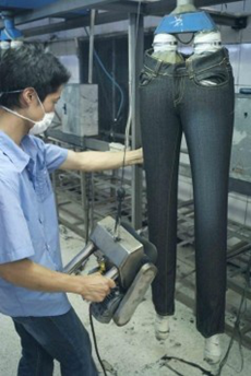 三:臭氧氧化與傳統(tǒng)方法的優(yōu)缺點(diǎn)比較 1. 用次氯酸鈉(婆梅度為18度)經(jīng)濟(jì);不好控制,有傷布的纖維。健康危害:經(jīng)常用手接觸本品的工人,手掌大量出汗,指甲變薄,毛發(fā)脫落。本品有致敏作用。本品放出的氯氣有可能引起中毒。具腐蝕性,可致人體灼傷,具致敏性。 2. 用亞氯酸鈉和硫酸在加次氯酸鈉。價(jià)格比上一種高點(diǎn)。但比上一種好點(diǎn)。不傷布的纖維。亞氯酸鈉有強(qiáng)氧化性。在175℃時(shí)即分解而發(fā)熱,與可燃物質(zhì)接觸,即起猛烈爆炸,須注意安全。硫酸對環(huán)境有危害,對水體和土壤可造成酸性污染。具強(qiáng)腐蝕性、強(qiáng)刺激性,可致人體灼傷。 3. 高錳酸鉀、過醋酸和還原漂白方式 關(guān)于牛仔布漂白,除了用次氯酸鈉和亞氯酸鈉外,還可以用高錳酸鉀、過醋酸和還原漂白方式,具體需要根據(jù)牛仔布所用染料類型來選擇,傳統(tǒng)牛仔為還原淀籃染料,也有用硫化染料或直接染料代替,也有采用活性染料代替的,故此,需要根據(jù)具體情況考慮。 4. 臭氧氧化的優(yōu)點(diǎn) a) 無污染,臭氧為純凈物。在常溫下,易分解,生成氧氣和氧原子 b) 臭氧的氧化能力極強(qiáng)。 c) 運(yùn)行成本低 四:手工處理 1.手擦 a) 在洗水前,通過使用砂輪滾動摩擦而使布面染料褪色,手擦的地方通常是脾位和臀位,人為的機(jī)械褪色,讓牛褲在洗水后顯得自然地懷舊和泛白 b) 噴沙和手擦效果接近,但對布紋的效果有差別。噴沙后布紋模糊,沉底,而手擦后布紋清晰凸顯